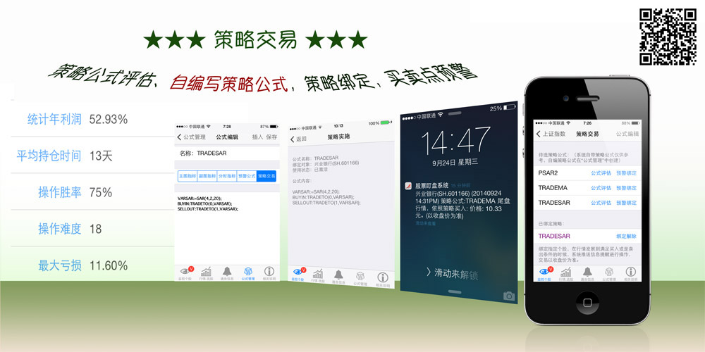用户编写策略交易公式,通过《股票盯盘系统》后台分析历史数据,算出策略相对于特定个股的盈利能力,风险系数,平均执仓天数等。策略公式可以绑定在个股上,达到策略指定的买点或是卖点的时候,后台即推送消息至手机上。以方便策略的实施。策略公式也可以拖放在分析图上,直观查看买点、买点、持仓价格等信息。