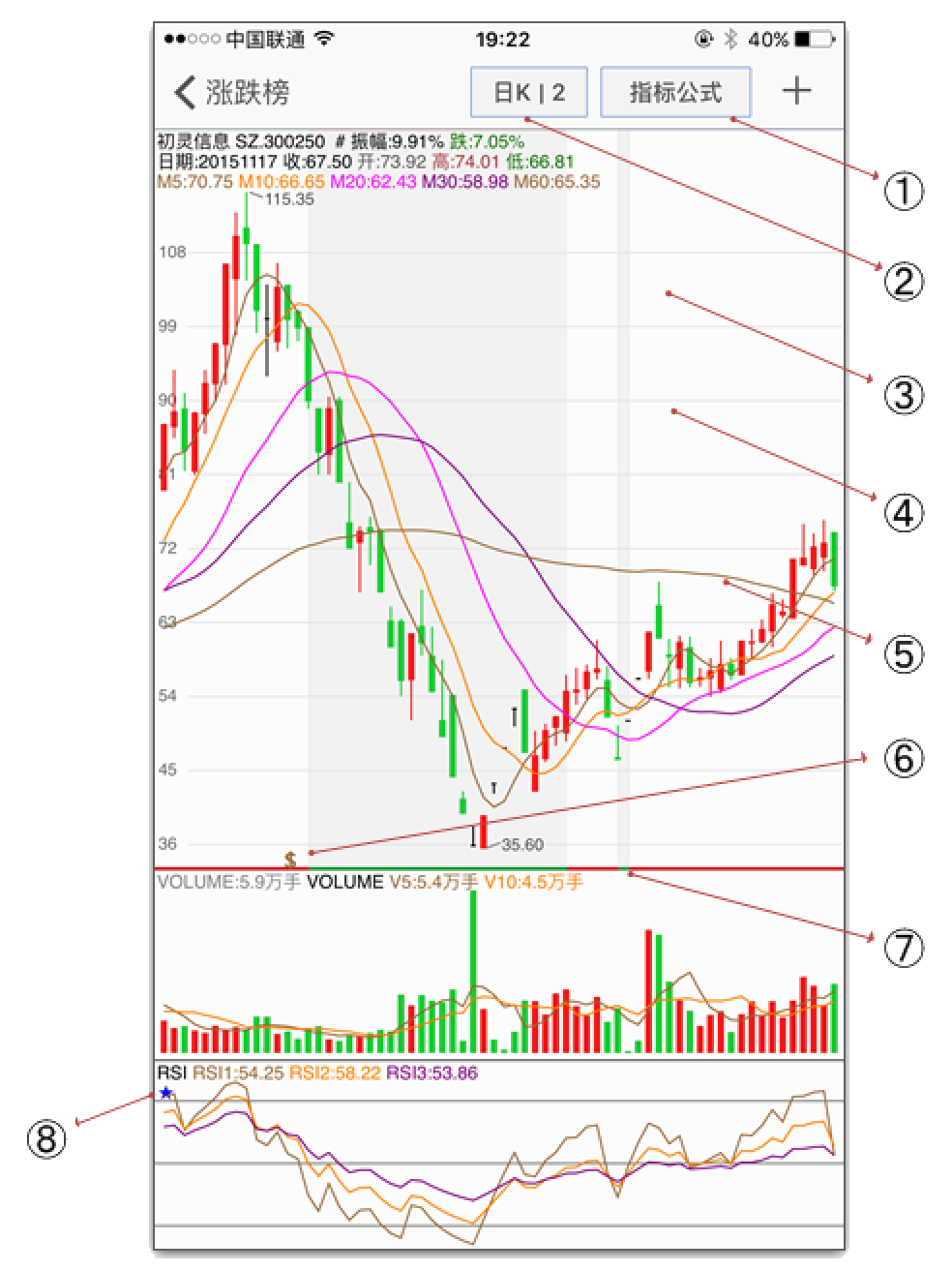 - 单指左右滑动,查看历史K线;单指向上或向下滑动,切换个股;双指捏合,放缩K线; 在最后一支K的地方,双指向左滑动,切换至分时图;