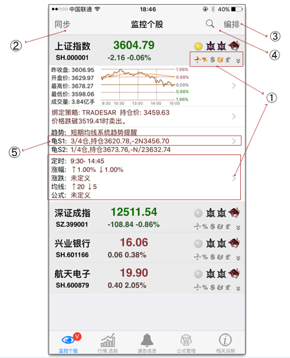 - 编排,可以编排监控列表中个股相对位置,或是删除监控个股。